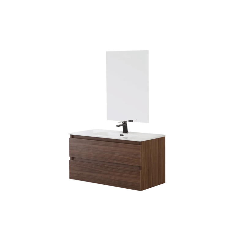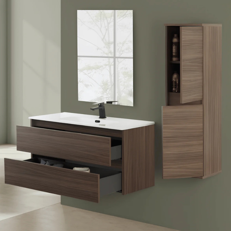 Il mobile bagno sospeso Revital in finitura noce canaletto è una proposta dal design caldo e contemporaneo, ideale per ambienti eleganti e funzionali. Realizzato in resistente nobilitato melaminico, si compone di una struttura con due cassetti ad estrazione totale dotati di guide soft-close, per una chiusura delicata e silenziosa. Il lavabo in ceramica bianca da 101x46x1,5 cm, con vasca interna da 46,5x26 cm, è progettato per garantire praticità e stile. Completa la composizione lo specchio a filo da 80x60 cm.
